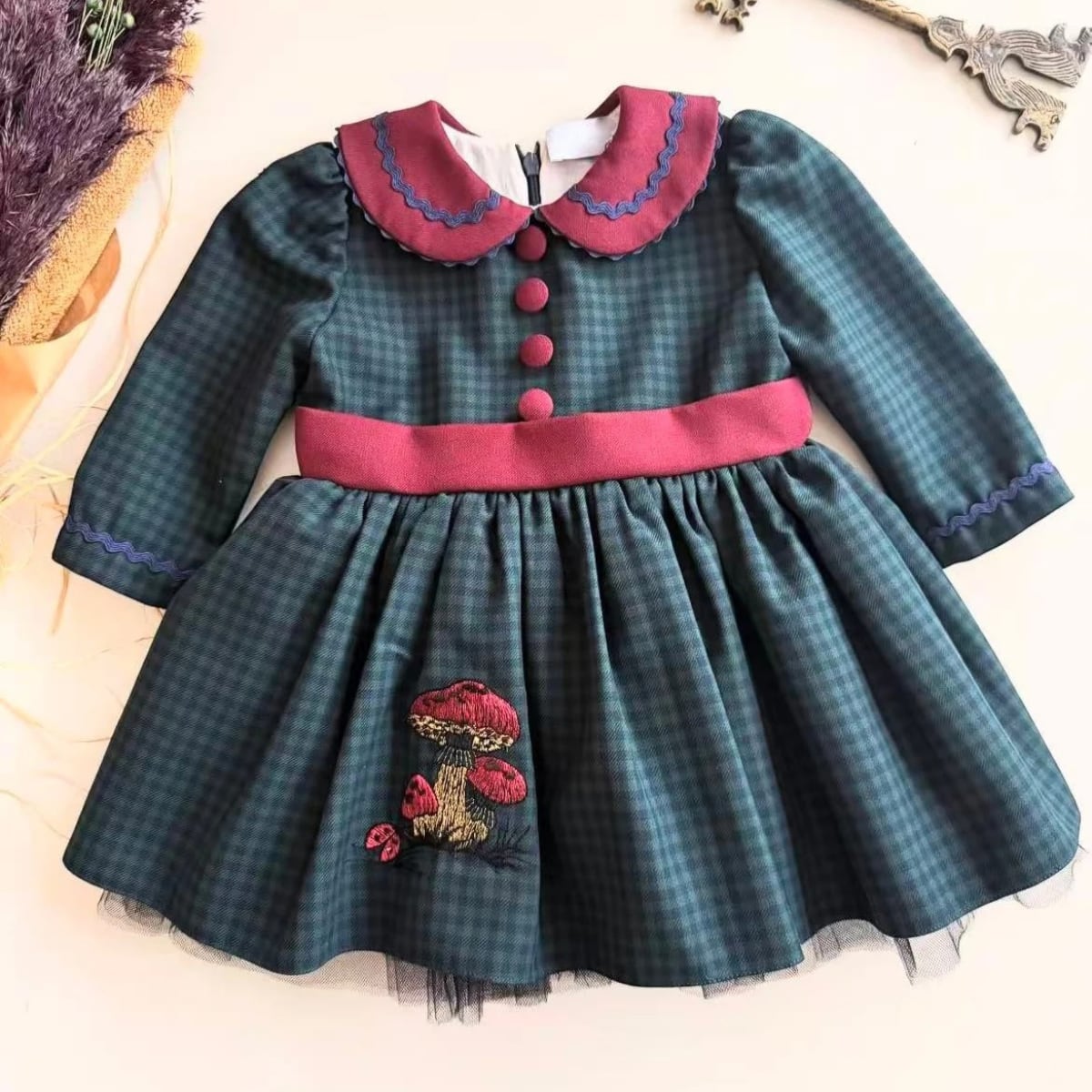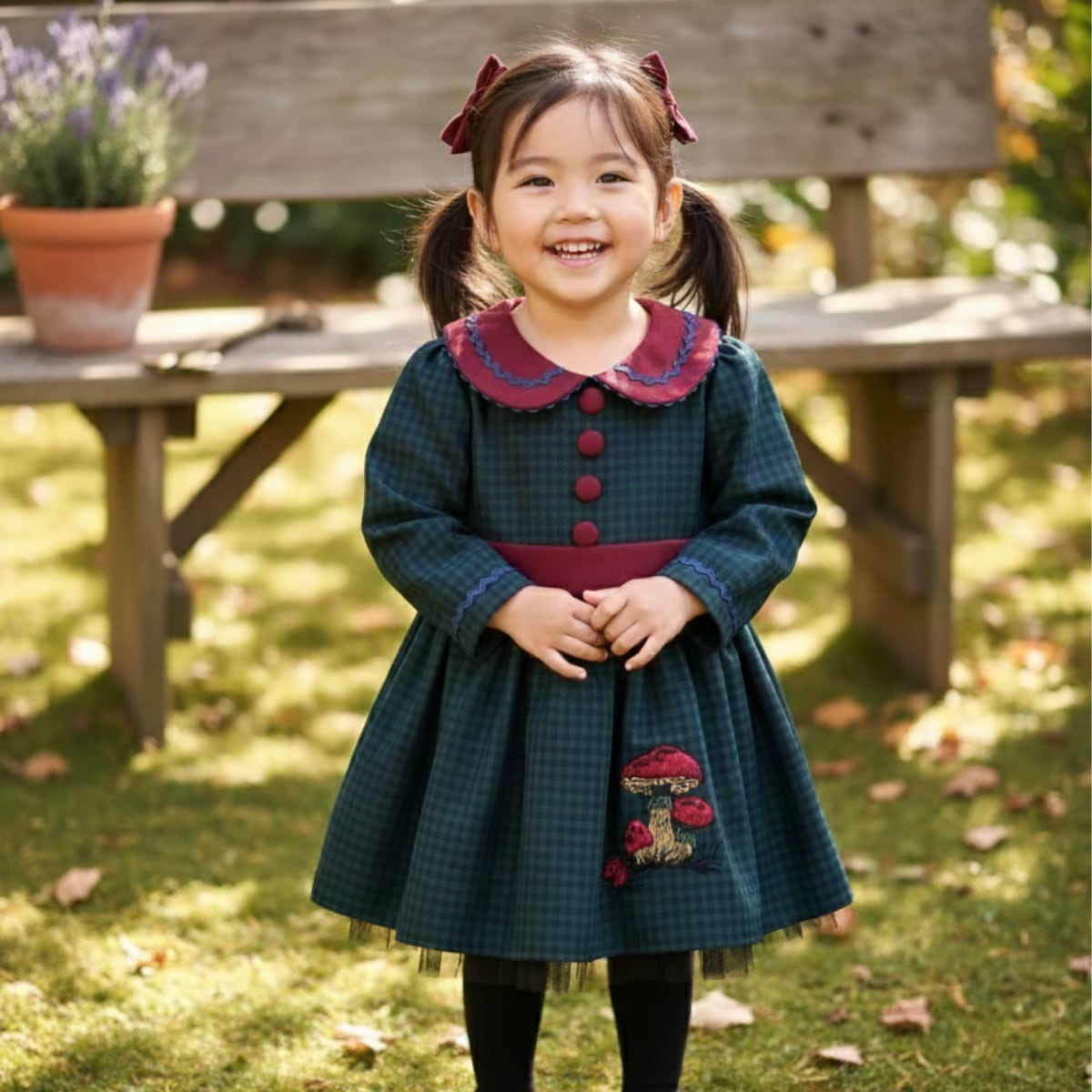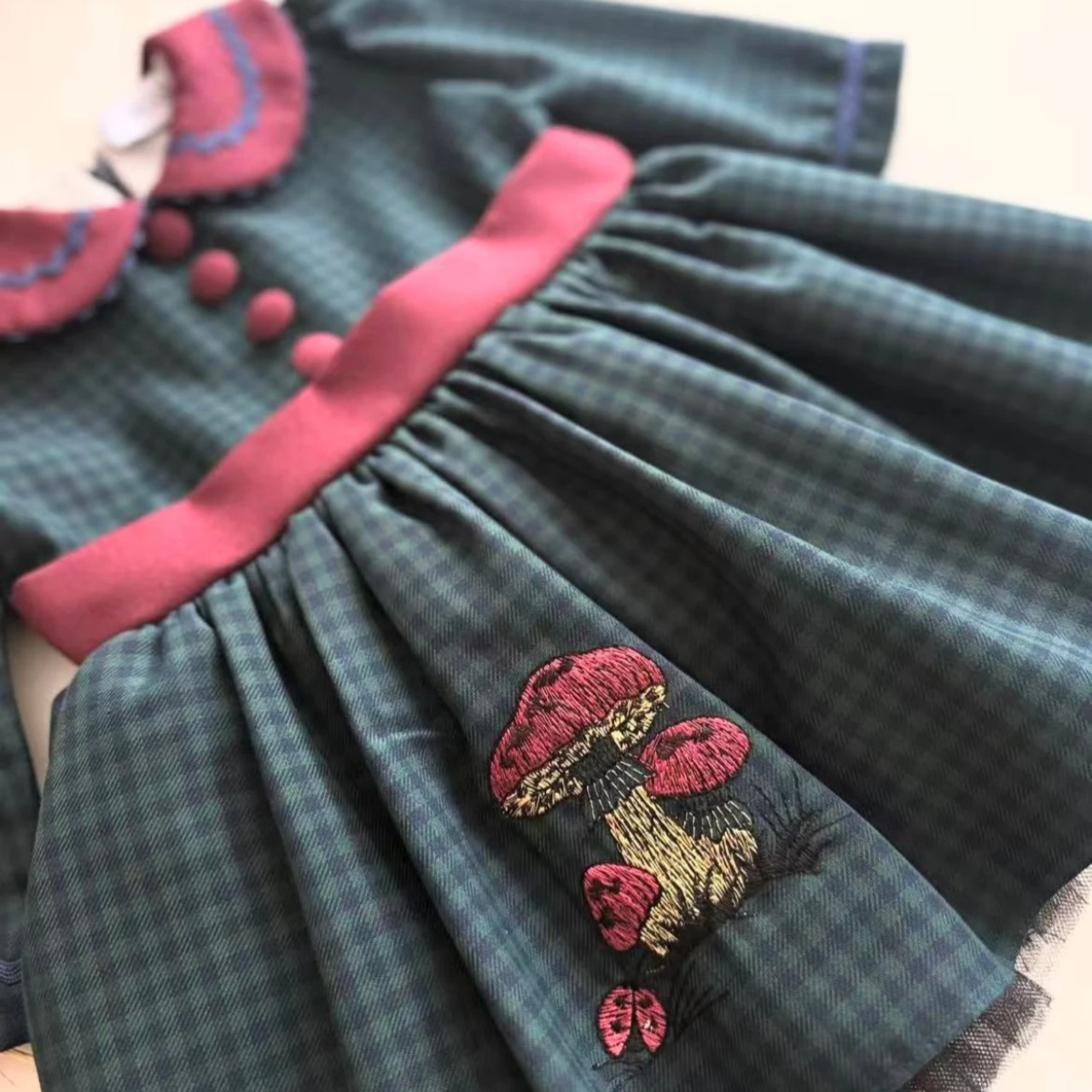 ベビー キッズ ワンピース 長袖 ヴィンテージ きのこ刺繍 グリーン 発表会 ドレス