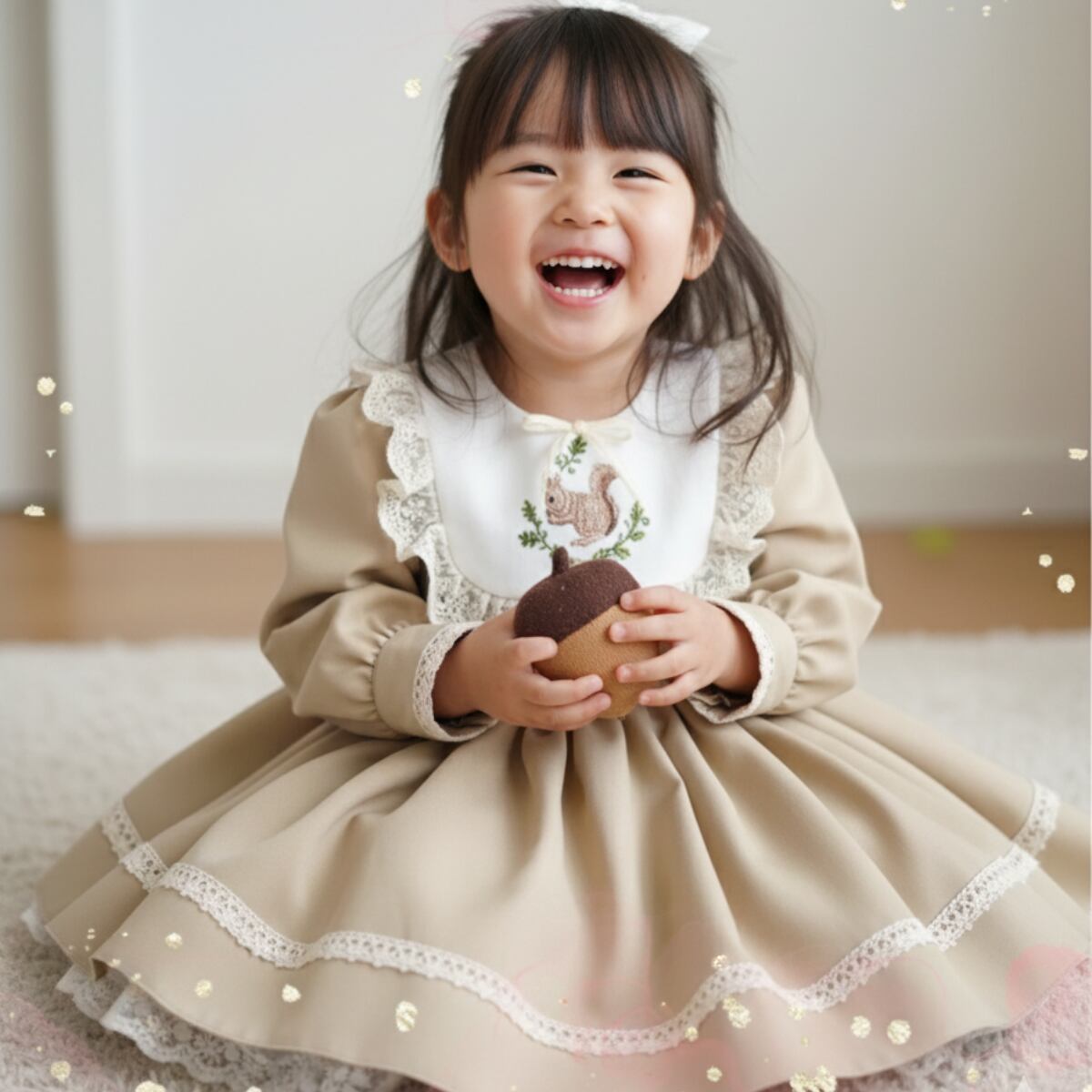 丁寧に施された愛らしいリスの刺繍が、お子様の独特な魅力を引き立てます。